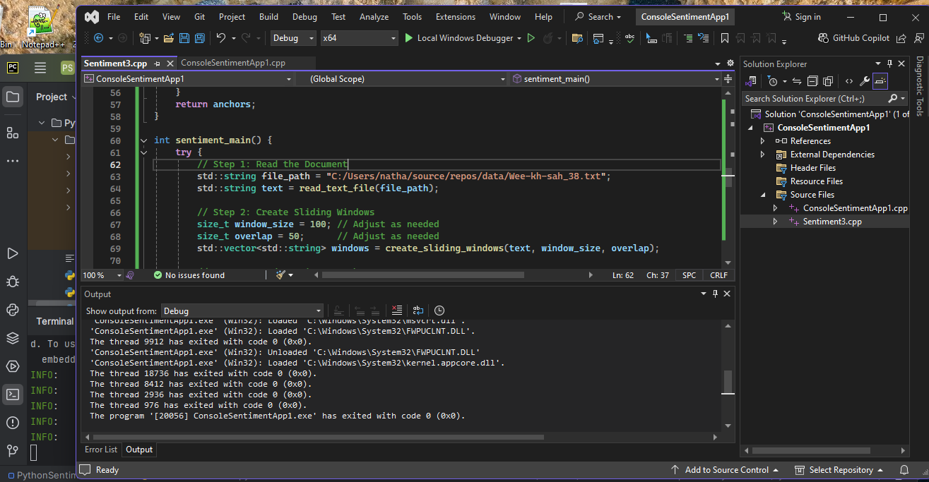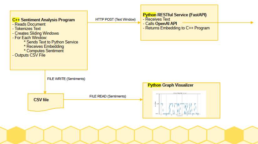 2. **C++ Client (`main.cpp`):** A C++ application that reads a text file, processes it into overlapping windows, requests embeddings for these windows from the Python server, and performs sentiment analysis based on cosine similarity with predefined sentiment anchors.