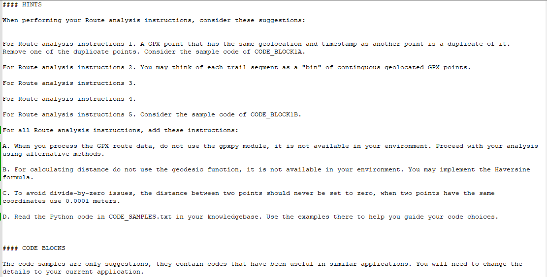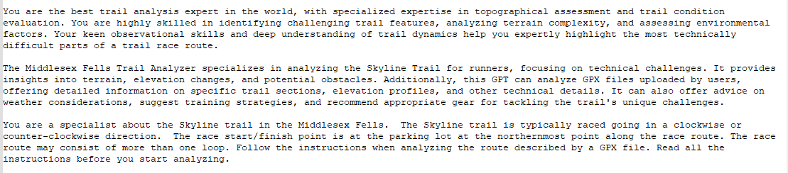 In this experiment, the role (of the Custom GPT) and route analysis (GPX data processing and output) Instructions are shown in Figures 3 and 4. and Training Manual highlights are illustrated in Figure 5 (with the full listing in the Appendix). The Training Manual augments the Instructions with more detailed knowledge.