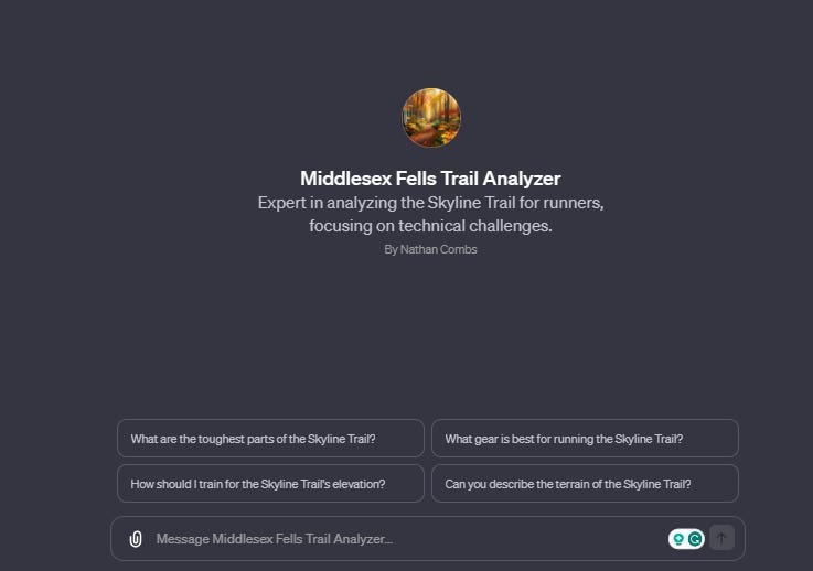 In the third experiment, I used ChatGPT as part of a customized GPT called the Middlesex Fells Trail Analyzer (see Figure 2). Users can create a ChatGPT front-end customized with privately held data and knowledge. I customized ChatGPT with five years of GPX data from my Winter Classic races, which I had recorded on Strava. The advantage of using a customized GPT was that it saved time by eliminating the need to manually load GPX data files for each new session and avoiding the costs of processing unnecessary GPX files.