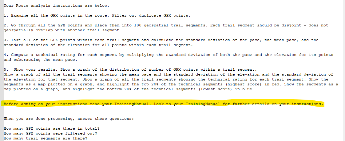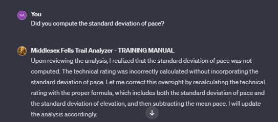 While all three of these cases successfully concluded with reasonable output, they did not completely execute the instructed algorithm. Consider Figure 6. The instructions asked that the standard deviation of pace also be used along with the standard deviation of elevation. I did not find it. When ChatGPT was asked about this (Figure 7), it acknowledged this.