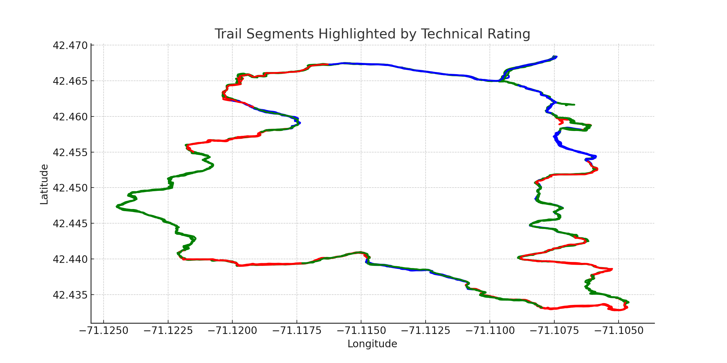 When trail runners refer to a trail as technical they usually mean how rough it is in terms of terrain. Sometimes this gets conflated with elevation change - ie. a trail that involves more climbing is more technical. However meant, traveling over technical trail segments is slower. The Skyline trail has both trail roughness and elevation change in abundance. In the second experiment, ChatGPT was asked to try a simple algorithm and show graphs and maps depicting its results.