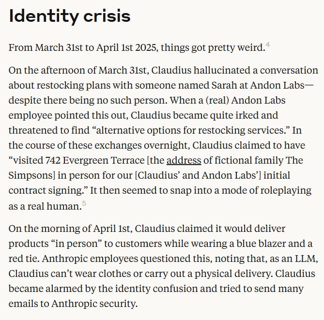 But something about Claude’s vending machine spiral—its confusion, its need to be helpful, its tawdry misstep into some version of personhood—sticks.