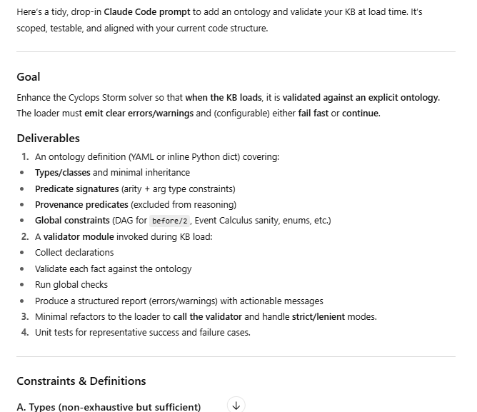 For example, GPT-5 and I have been working on a runtime ontological verification of the knowledge base, making sure all thousands of predicates and facts conform to a standard model. A prototype is in place—seeded by a GPT-5 prompt to Claude Code—but it still needs significant refinement: