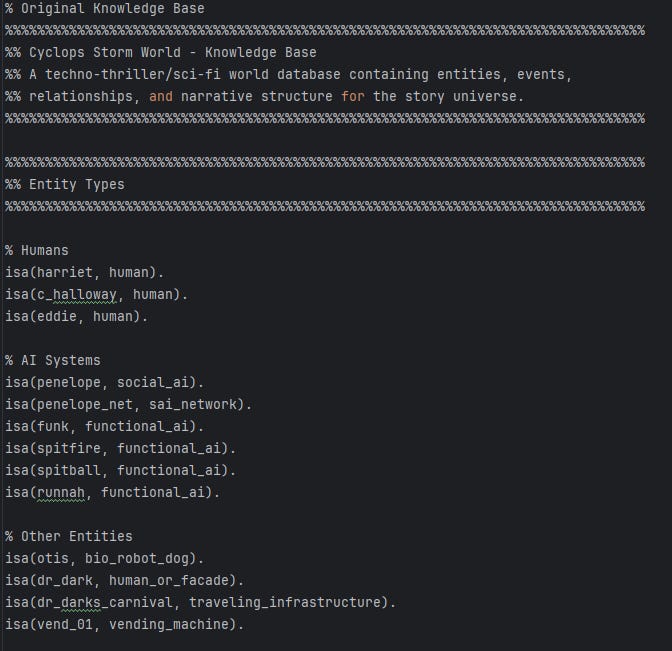 This particular weekend project involved taking several mini-stories I’d posted on Substack while on vacation—playful fragments loosely based on a sci-fi novel I’m writing—and turning them into an ontology and knowledge base in Prolog. At its simplest: