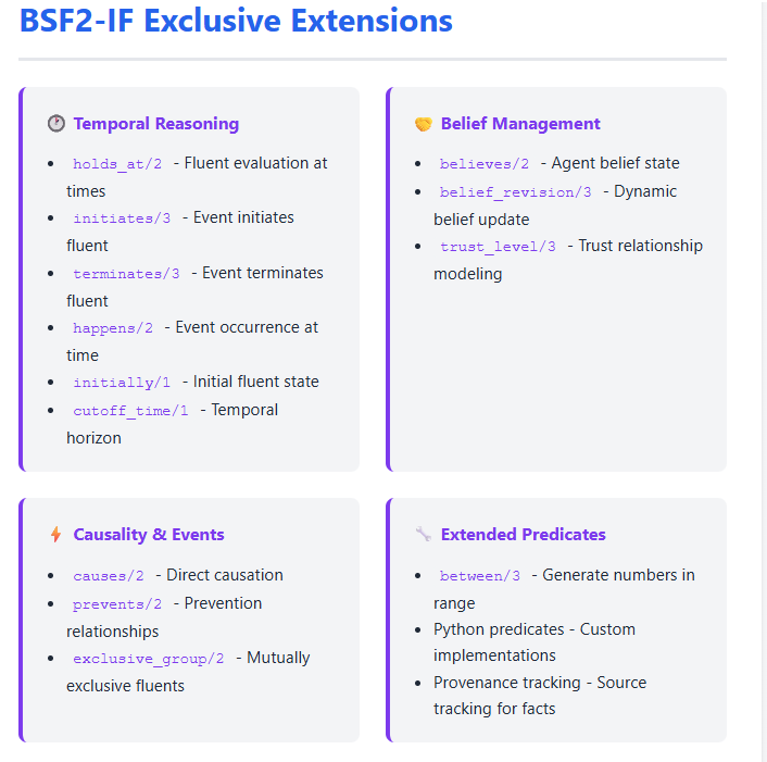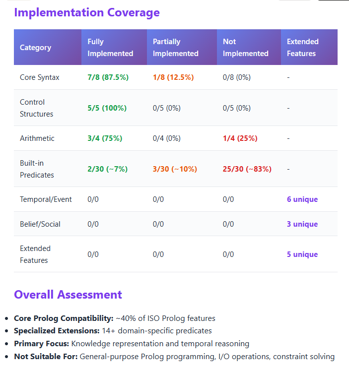 What makes it unique is its 14+ specialized extensions for temporal reasoning, belief management, and causal modeling that go well beyond standard Prolog. It’s essentially a domain-specific reasoning engine built on Prolog foundations rather than a general-purpose Prolog implementation.