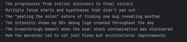I’m with Claude Code on the takeaways. The most “video-game” part wasn’t the bug itself—it was the whipsaw navigating the problem space. After a lot of trial and error, the real win was finding the right choke points to attach instrumentation so Claude could zero in on root causes. Plenty of false starts. Plenty of rabbit holes. Plenty of drama. In Claude’s words: