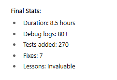 Behind the timestamps and log files was 8.5 hours of intense focus, frustration, false victories, and ultimate triumph. The commit messages tell the story: