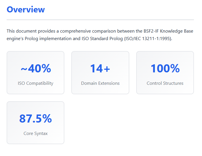 The BSF2-IF KB Engine implements about 40% of ISO Prolog features, focusing on core language constructs like syntax, unification, control structures, and arithmetic. However, it lacks many standard built-in predicates (only ~7% implemented), particularly for I/O, meta-predicates, and database manipulation.