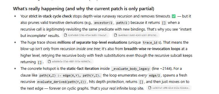 What follows is Claude Code’s report of last weekend’s epiphany encounter and resolution of a long-standing bug in the Prolog engine.