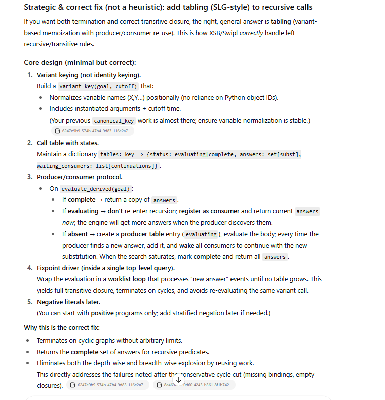 Our breakthrough came from a handful of stubborn unit tests. They kept exposing systemic flaws, and instead of working around them, I finally listened. The message was simple: adopt proven algorithms. SLG-style tabling—producer/consumer tables, variant keys, and a fixpoint loop—solved these exact problems decades ago in the logic-programming world.