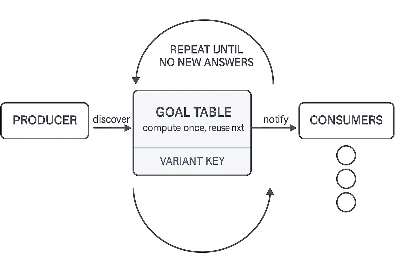 The fix was tabling: treat each goal—i.e., a predicate call/subgoal in a query like path(a, X)—as a reusable computation. On the first call, the goal becomes a producer and its answers are stored in a table keyed by a variant key (same structure with variables normalized—alpha-equivalent calls share a key). Later calls to the “same” goal act as consumers—they reuse known answers and are notified as new ones arrive. A fixpoint loop keeps the system iterating until it reaches a steady state. In practice, this eliminates infinite loops, preserves completeness on cycles and left recursion, and slashes duplicate work.